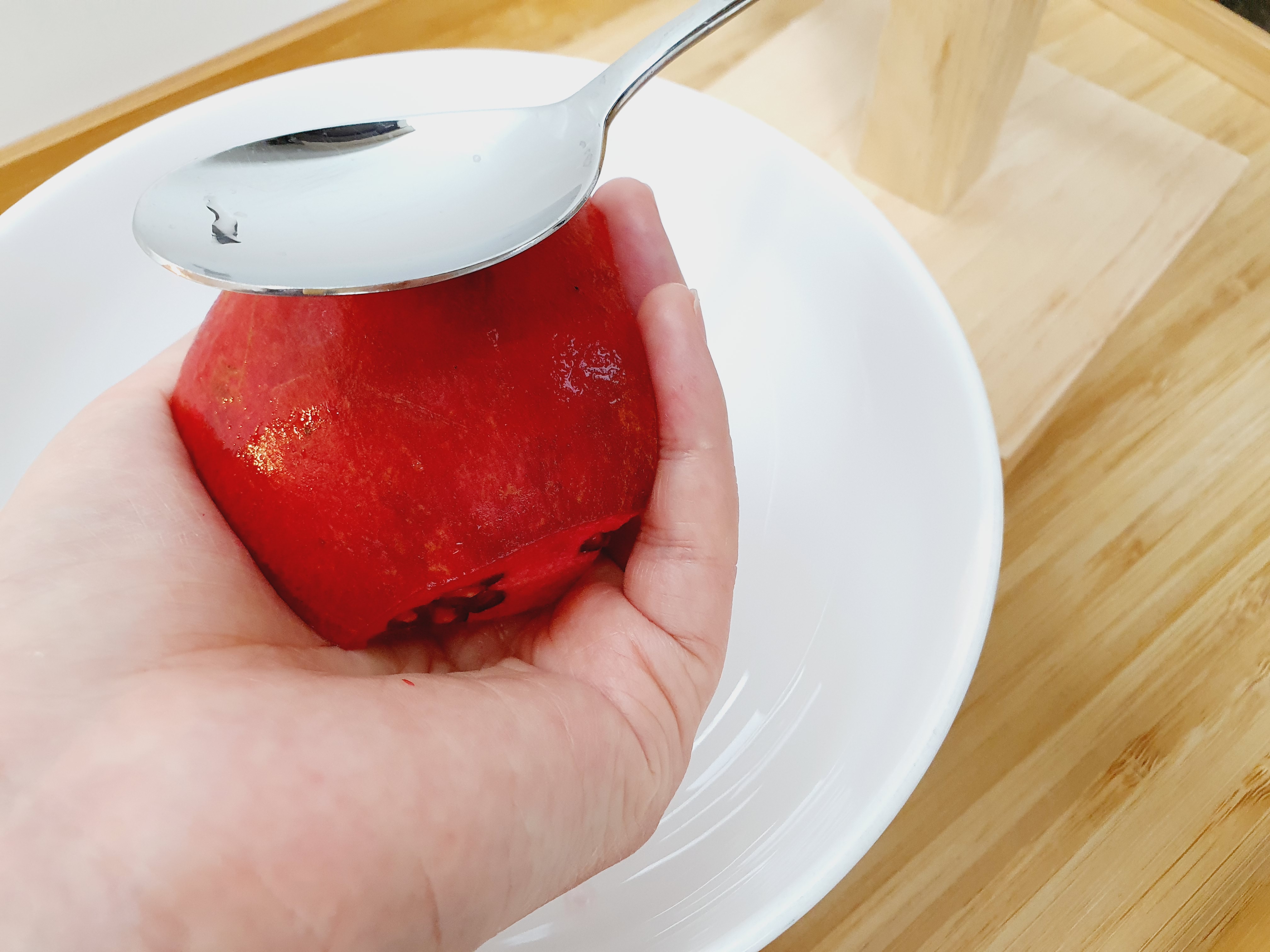 2단계로는 숟가락 오목한 쪽으로 석류 알맹이들을 살살 긁어내고,